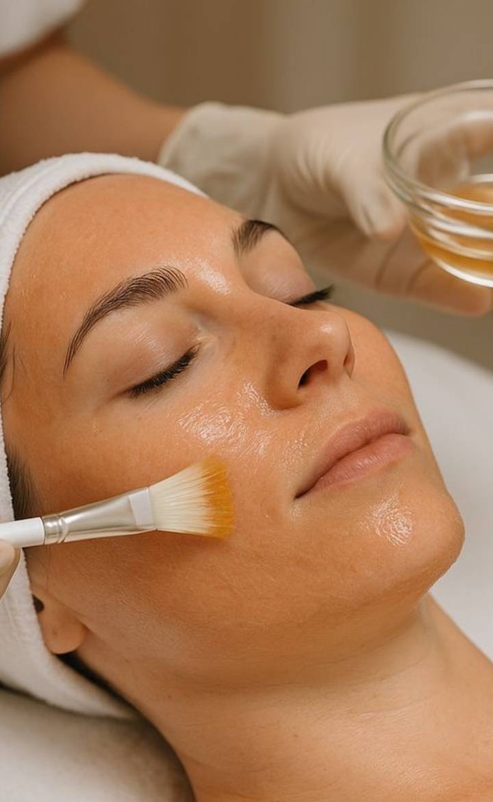 Aplicación de ácidos cosméticos específicos que exfolian las capas superficiales de la piel para promover regeneración y activar procesos reparativos naturales.